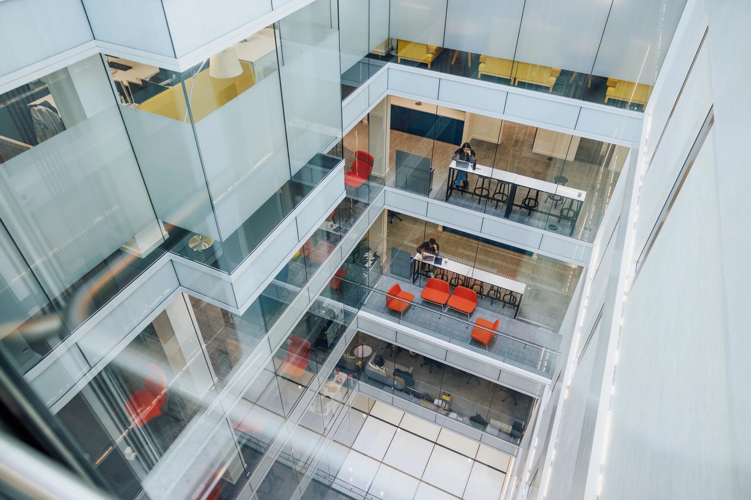 Spanning 45,000 square feet, the space includes office areas, event venues, and a café, with a striking glass atrium to let in the light.