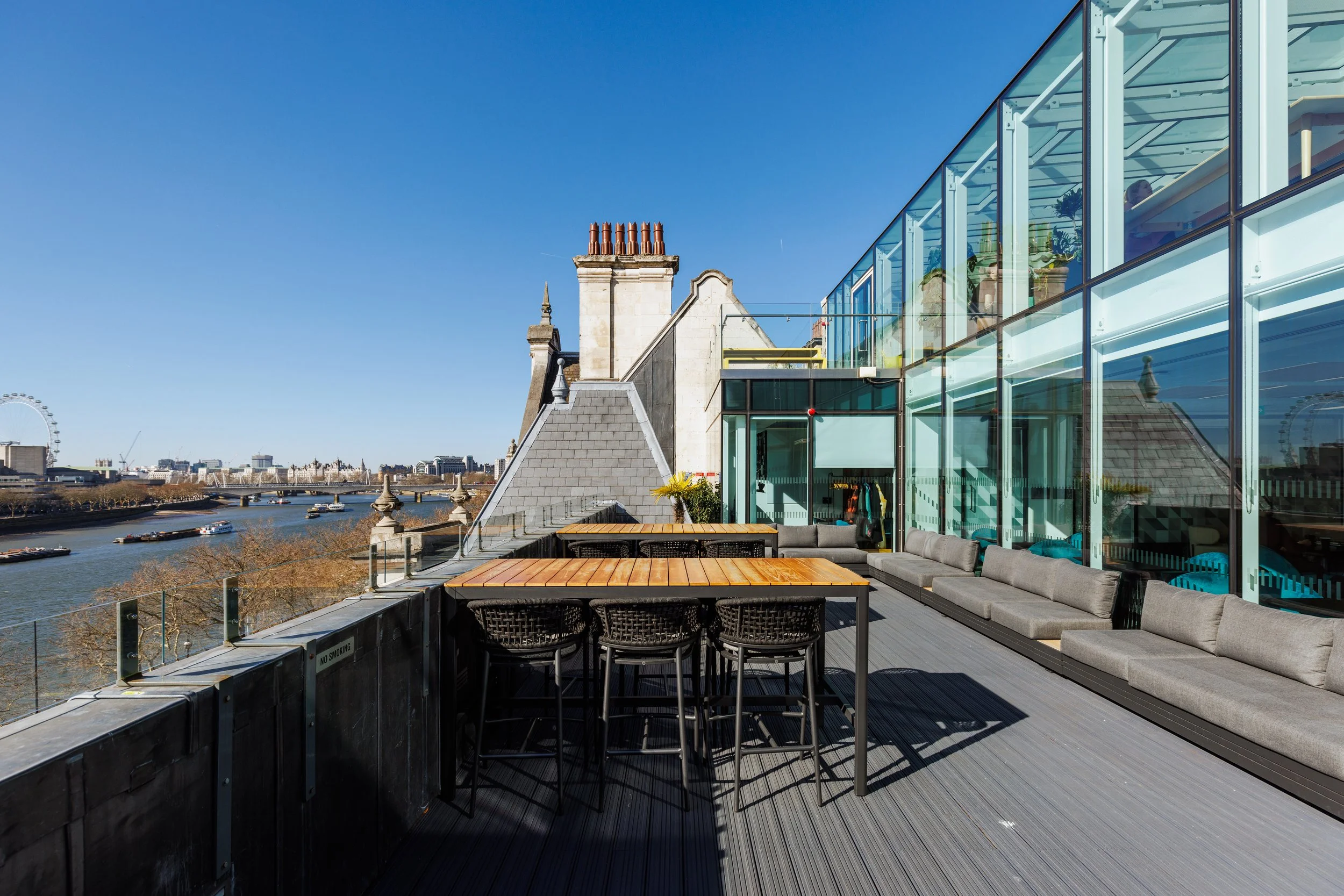 The sixth-floor lounge and rooftop terrace offer views of the London cityscape. Additional large meeting rooms overlook the river, providing welcoming space for landmark meetings and events for up to 24 people. Special booking rates are available for Nest58 members.